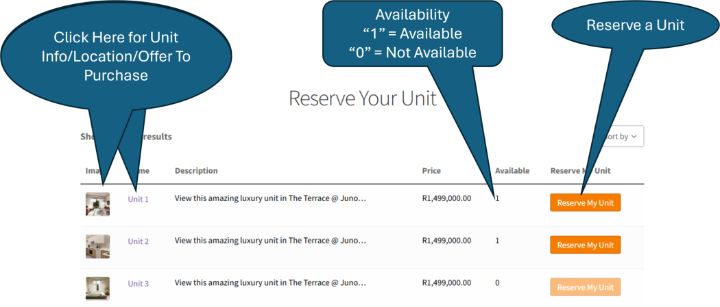 button. Availibility is shown as “1” . If “0” it means that the unit is already reserved. Check back in 48 - hours to see which