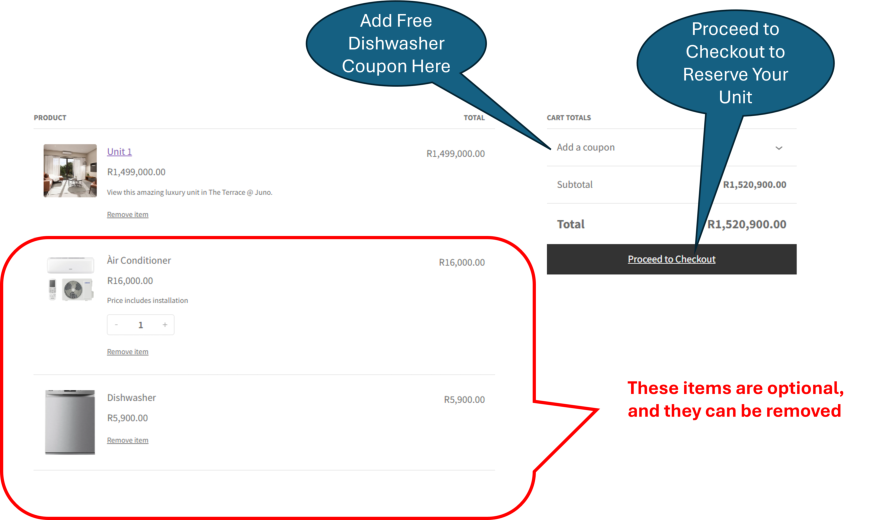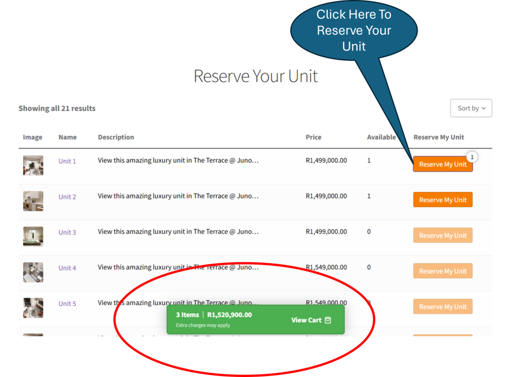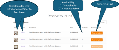 Please allow a couple of seconds for the available properties to load. Scroll Down List : Click on the “Reserve My Unit”